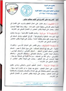 وعلي أن يتقدم العضو بالمستندات التي تفيد حصوله علي التدريب لتأهيل في الدوارات للتحكيم ، ومنها الدبلومة الاجرائية ودبلومة التصنيف التي يكون بدورها قيدا بجدول المحكمين والذي يطرح علي المتقاضيين في الدعاوي التي تفصل فيها النقابة العامة كونها المؤسسة القانونية للفصل القضائي الخاص بين المتنازعيين .